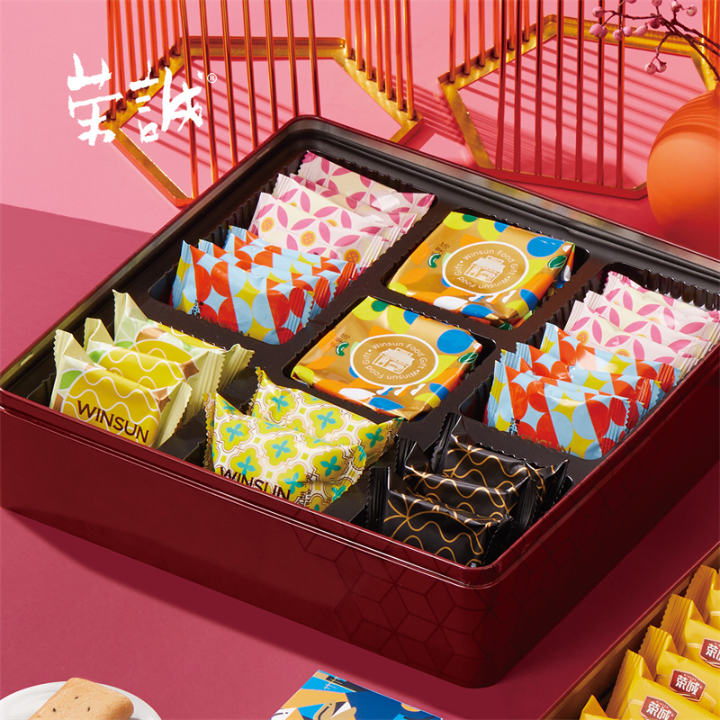 【編 碼】 CGT2208 【條形碼】 6925755534508 【尺 寸】 29.8x29.8x14.3cm 【凈含量】 845g 【規(guī) 格】 845gx4盒/箱 【內(nèi)容物】 100g綜合果仁x1,48g櫻花荔枝味曲奇x1,30g堅(jiān)果撻x2,35g特色果仁腐乳餅x2,8g果仁曲奇x8,10g香焙杏仁酥x8,30g香妃鳳梨酥x3,30g黑金鳳梨酥x3,13.5g澳式金泊雞蛋卷(咸蛋黃)x9,13.5g澳式金泊雞蛋卷(芝麻原味)x9