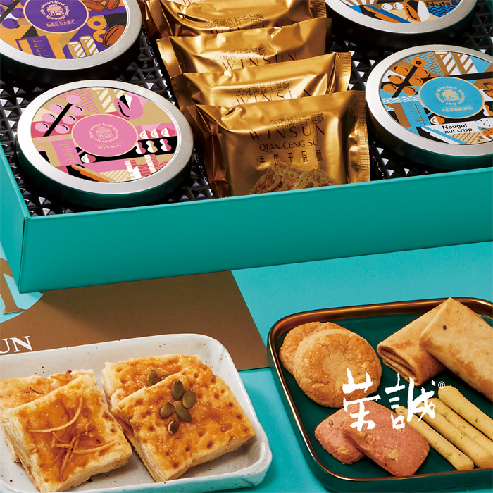 100g鹽焗巴旦木果仁x1,100g打手瓜子x1,100g綜合果仁x1,66g牛軋堅果酥(原味)x1,20g南瓜籽千層酥x3,20g椰絲千層酥x3,12g蔥香卡拉棒x3,12g芝士棒x3,12g巧巧軟曲奇(巧克力味)x3,10g香焙杏仁酥x4 ,8g果仁曲奇x4,13.5g澳式金泊雞蛋卷(芝麻原味)x3,13.5g澳式金泊雞蛋卷(咸蛋黃)x3